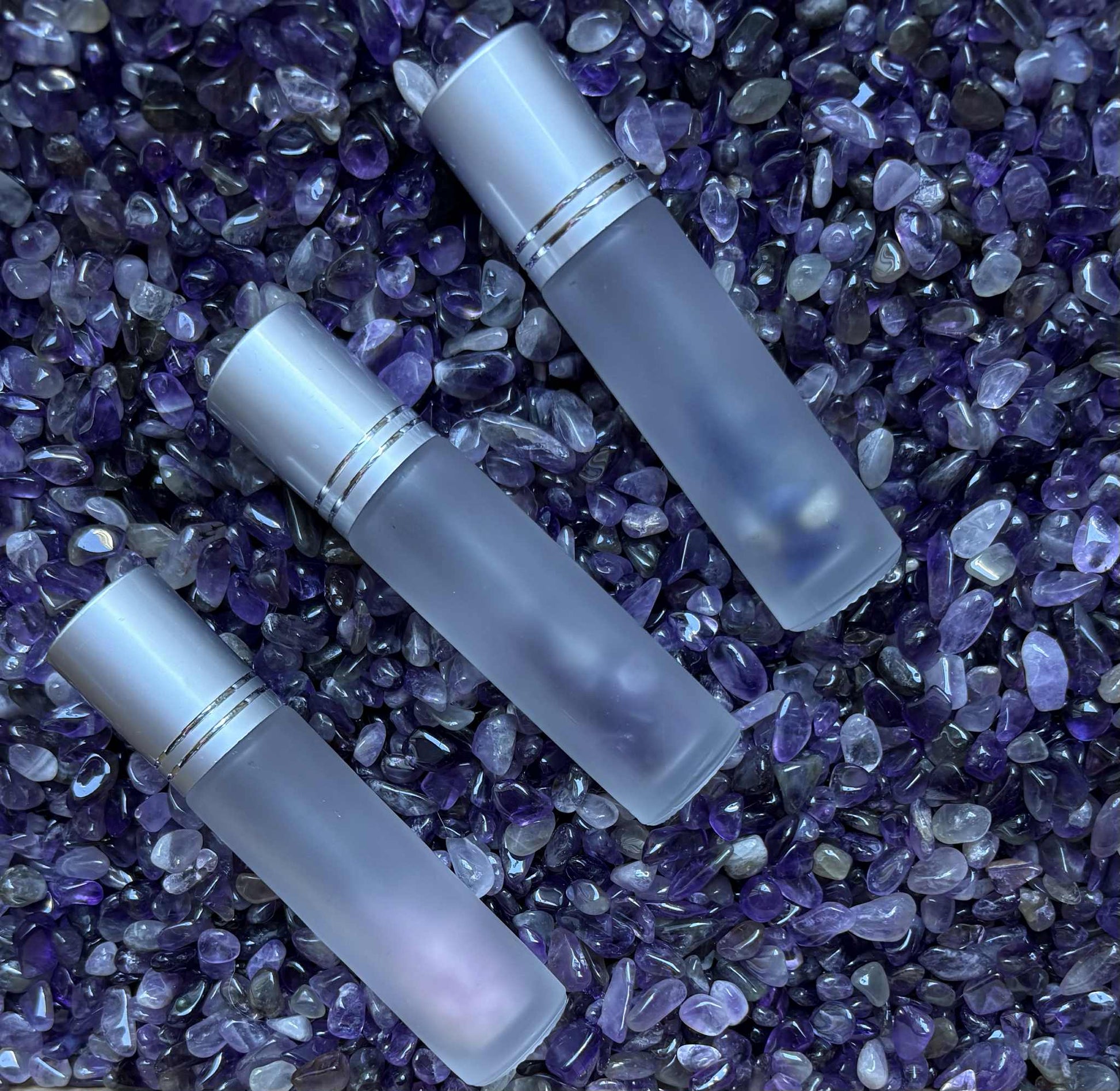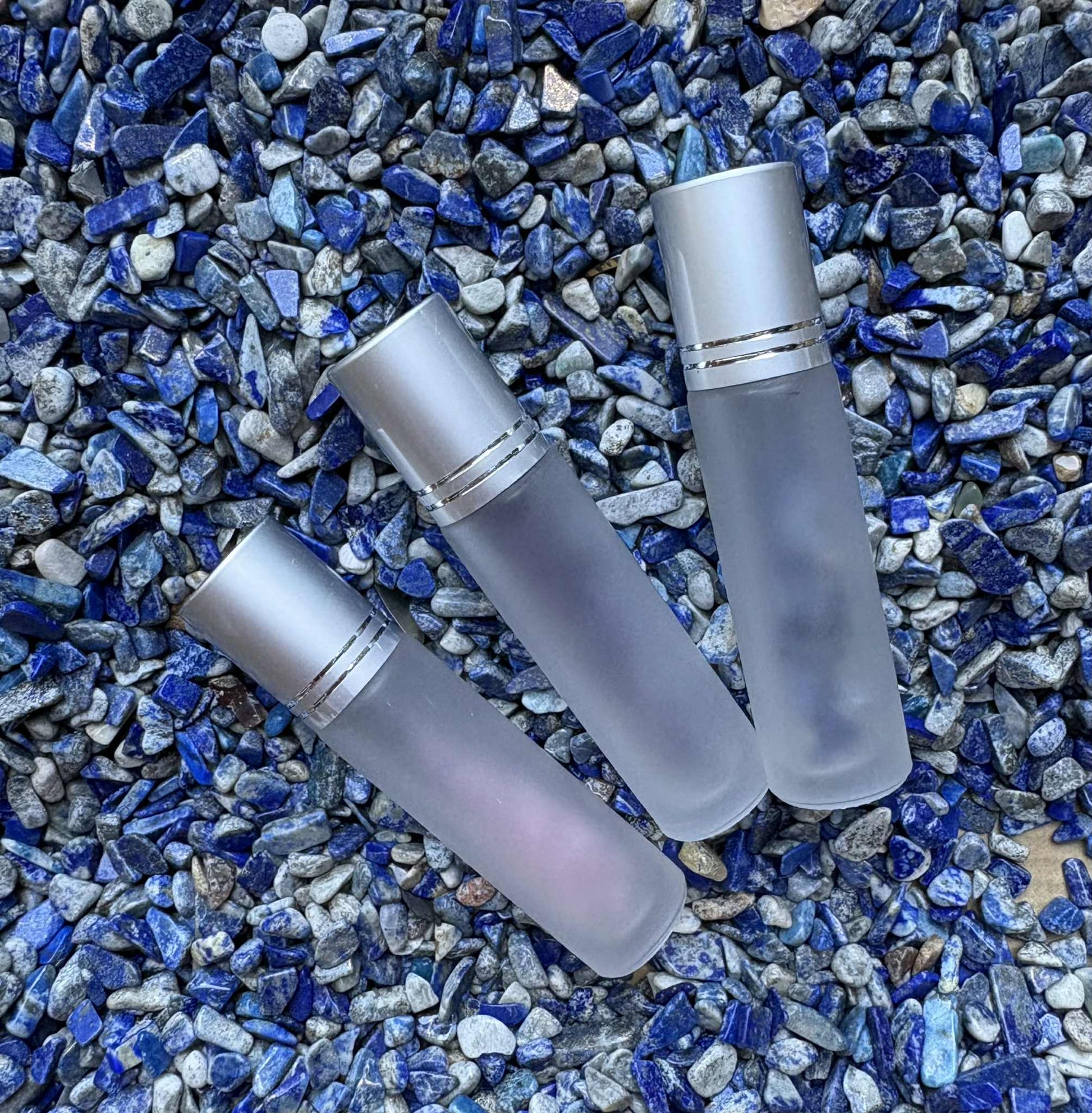 10ml Frosted Glass Rollerball Bottles with silver or gold cover filled with Crystals – Pack of 3